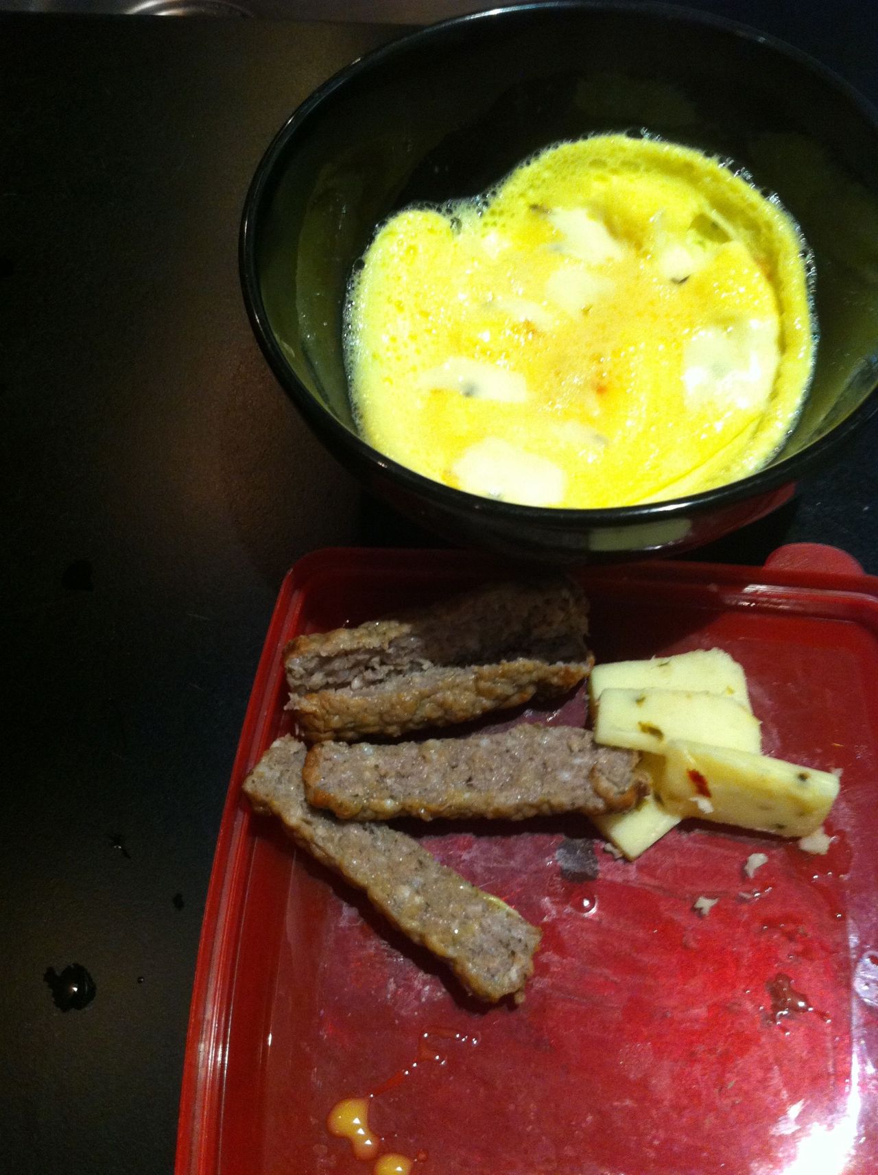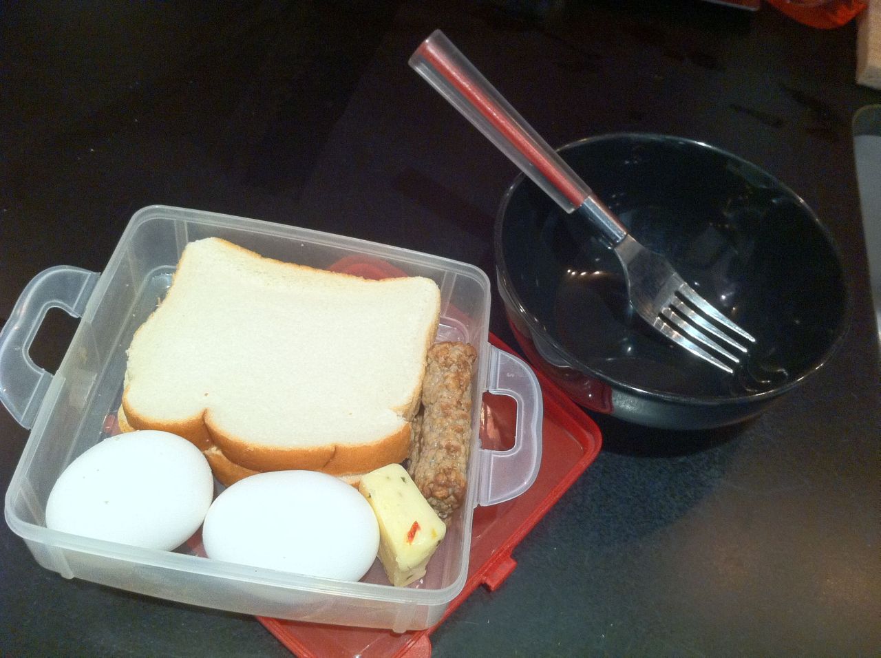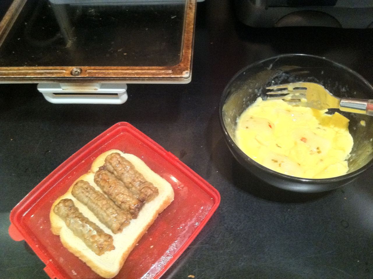 In order to prep you just need to get a piece of Tupperware that will fit 2 slices of bread, 2 eggs, a piece of cheese (I prefer something with spice, like a pepper-jack or chipolte cheddar), and any extras (in this case 2 sausages).