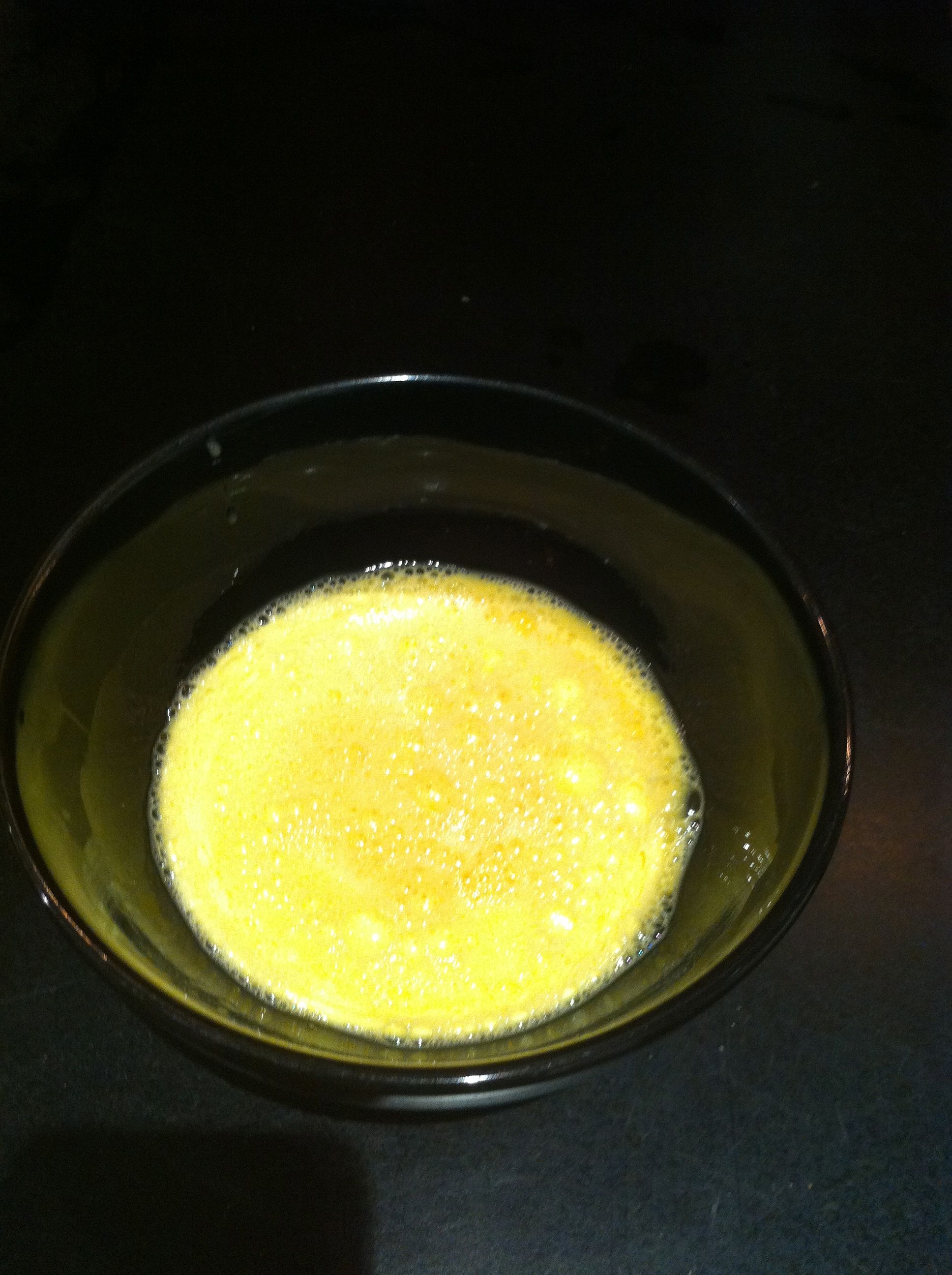 Once done it’ll look something like above. Scrap the sides and stir. There will be some pieces of cooked egg, but the majority will still be raw, but warm. place it back in the microwave for another 20 seconds.