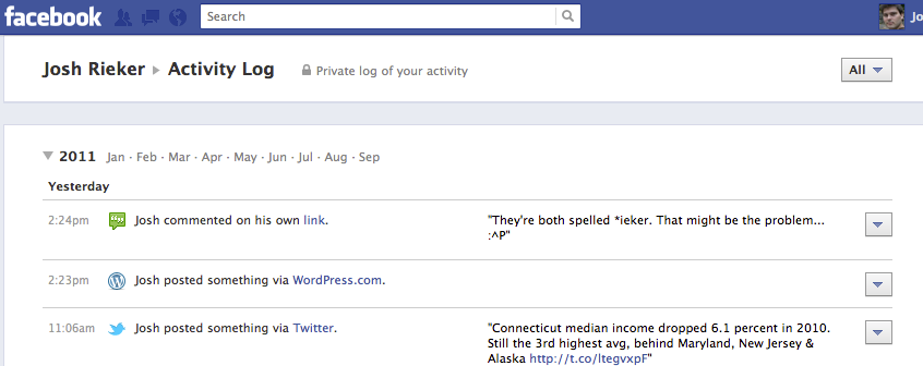This part isn’t public, it’s just for you to see.  Your activity log lists all your posts and activity, from today back to the beginning. Personally I think this is one of the two big things in the new set up.  Instead of going to multiple pages to manage what can and can’t interact with your life on Facebook, this page allows you to with a single click (more info in a bit).  Anything that you’ve every authorize to post, shows up here.  It gives a very good view of what you are posting, as well as what you’ve allowed to post for you, in one view.