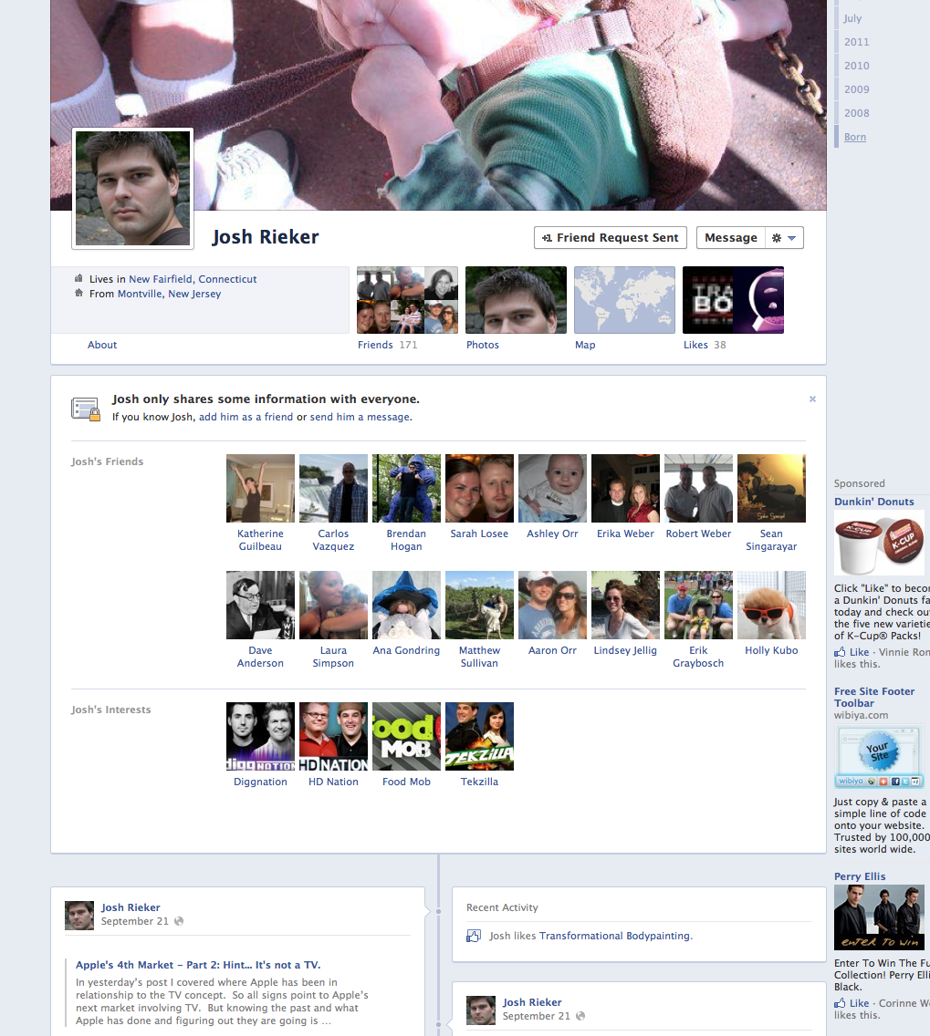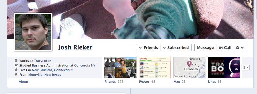 For friends this “public” section is greatly reduced, and looks a lot more like your own view of the info page.  Your friends, photos, checkins, etc are all group in the info page.  If there are any mutual friends it will display a number in the friends section.  Friends get an additional buttons up top that allow to show if you’ve friended them or are subscribed, or both (you don’t have to be friends with someone just because they are friends with you in this new Facebook).  There are also buttons to message or send a video call (which Facebook introduced not too long ago using Skype)