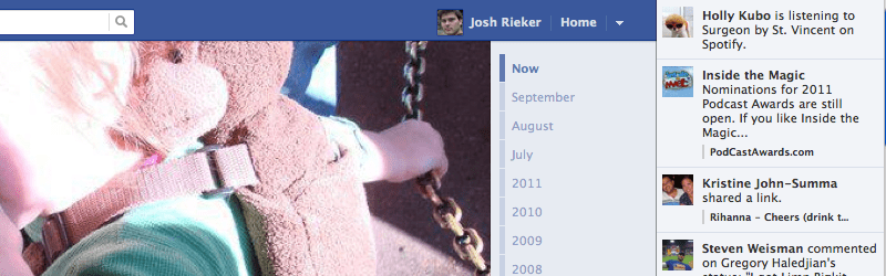 Although this isn’t “new”, it’s still pretty recent.  At least recent enough for them to point it out while going over the new design, so I figure I will too.  Ticker takes a lot of the “extra” stuff that’s been floating in your main page, and pushes it off to the side.  This includes post that you will see in your Story view, but also smaller things like what songs are playing, or game scores, or game requests… all that annoying stuff you often block.  It’s constantly moving so you can pay attention to it or not.  Either way it’ll keep changing and updating as you move along.