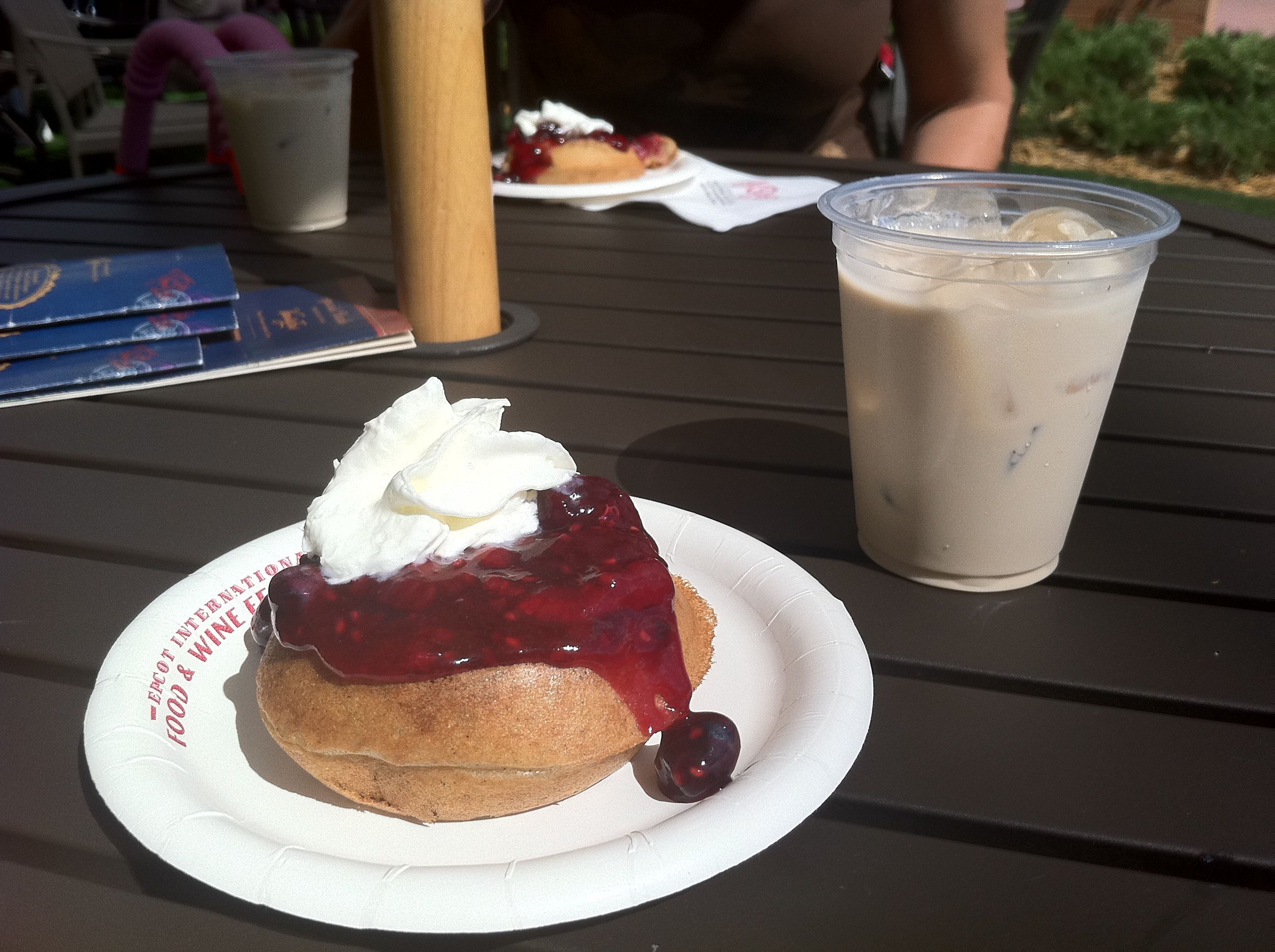 This was one of the first booths I tried. As such I missed taking pictures of the mussels and truffels. Luckily the Disney Food Blog didn’t, so these are their pictures. For the coffee and waffles, well let’s say I had a couple of opportunities to take the images. The items haven’t really changed from last year. The mussels aren’t over cooked and have a very nice sauce that doesn’t mask the mussel. The truffles… were very store bought. Good, but was a bit disappointed when I saw it was a pre-packed item. The combination of light and crispy waffle with berries and the chocolaty iced coffee is worth getting to the back of the park early each day to start off your exploration with brunch. Every day. Delicious. Not too overpowering.