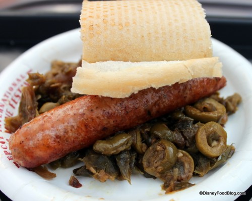 This was something I grabbed along the way, and such forgot to take a picture (photo from DisneyFoodBlog). It wasn’t anything unique but while passing I got the smell of sausage and peppers and had to give it a taste. The olives I thought was an odd addition. Tasty, but odd. The sausage was a bit more flavorful and spicy than an Italian sausage, but also tougher. About what I’d expect from a linguica sausage (you can get the in the grocery by me). I kept trying to make a sandwich with the bread, but ended up eating it separate. It was a standard fare french loaf piece of bread. Overall… I’d say skip it.