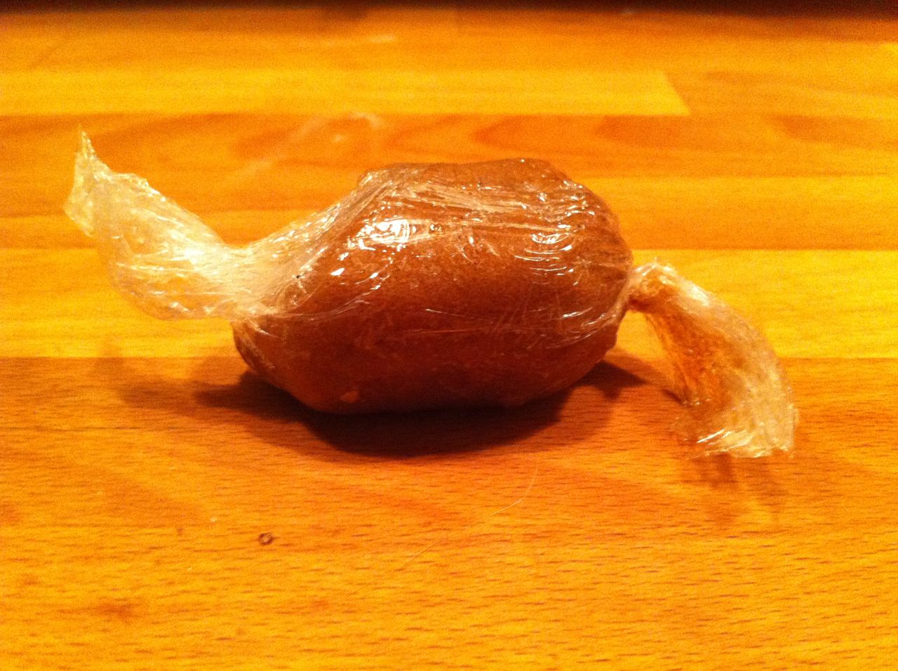 Take all those ingredients and blend together (mixer tends to work best). Put in the fridge till it stiffens up some. Place 2 tablespoons of the mixture in the middle of plastic wrap and wrap like a pice of candy. Place back in the fridge (or freezer if you plan on making tons for later).