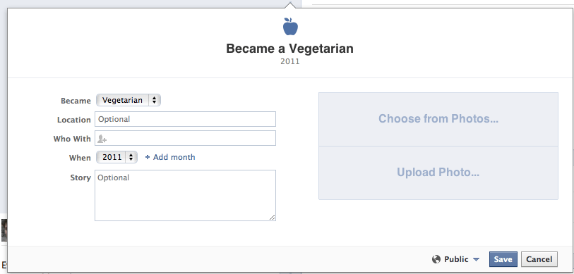Once you choose a category and a Life Event you then are presented with a number of options. The options will vary depending on what event you selected. Most events will have some similarities though. You can add new photos or choose from existing ones in your albums. Most events will also have a date you can choose from (although only required info is the year. You can add or skip the month and date if you prefer). You can also write an optional story to be associated with the event.