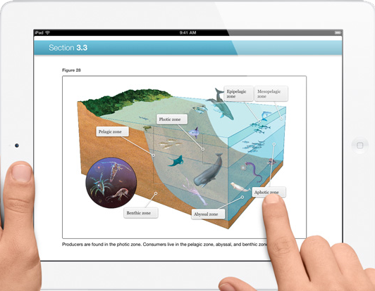 • Interactive images – Plain old images also have gotten an  update too.  You can now select different parts of an image and have it show labels, or more information.  You can pinch and zoom to get high-resolution images to focus in on the important parts.  you can move around to get an image much bigger than would ever fit in a traditional book.