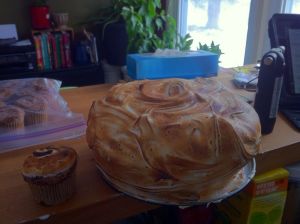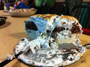 You end up with a nice layered cake with the rich chocolatey and basic vanilla flavors melded together with a nice slighly burnt marshmallow cloud. You might want to be careful with how much frosting you put on top… otherwise you may end up with a huge, and delicious, mess. As seen at left.